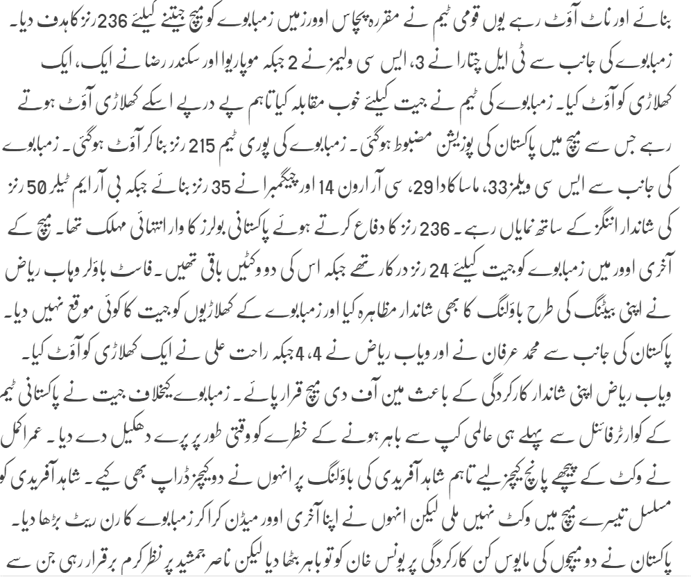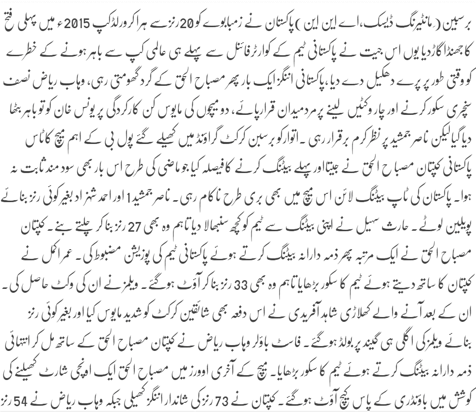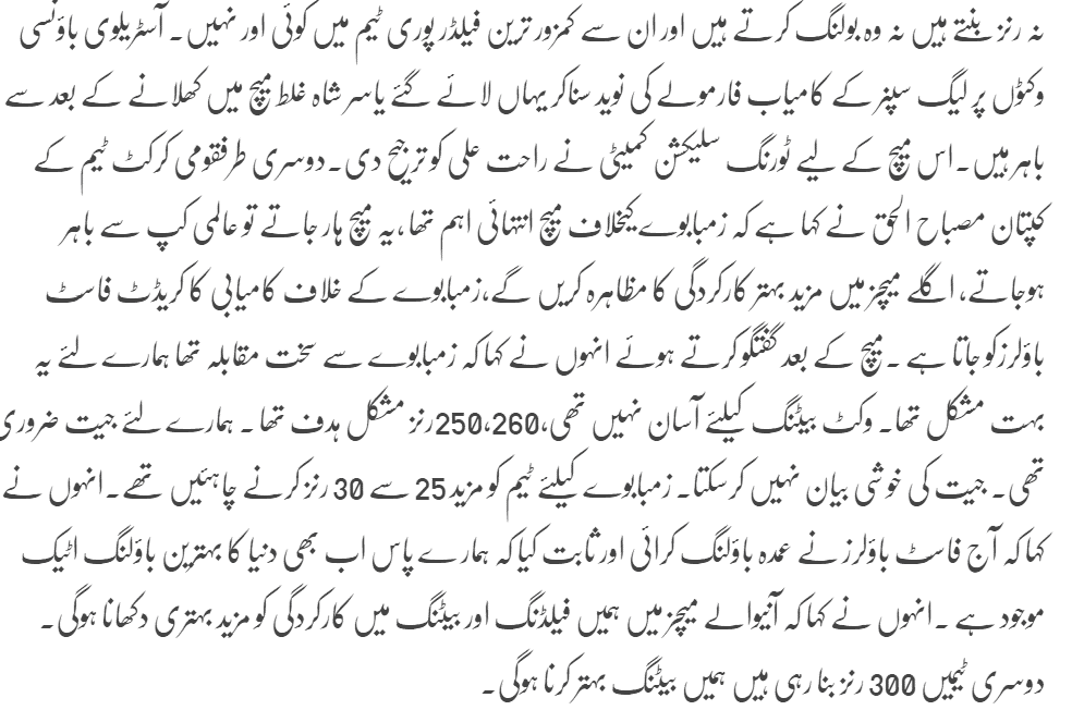 Riaz (4-45) then picked up Craig Ervine (14) and Tawanda Mupariwa (zero) in the space of three deliveries in his eighth over to put the chase beyond Zimbabwe’s reach. Earlier, Chatara (3-35) got ample movement and bounce off the surface to send back openers Nasir Jamshed (1) and Ahmed Shehzad (0) in his first two overs after Misbah had won the toss and opted to bat. We hope that Pak team will improve their skills to win the next 3 important matches to qualify for the quarter finals and then continue their journey towards a victorious stand.